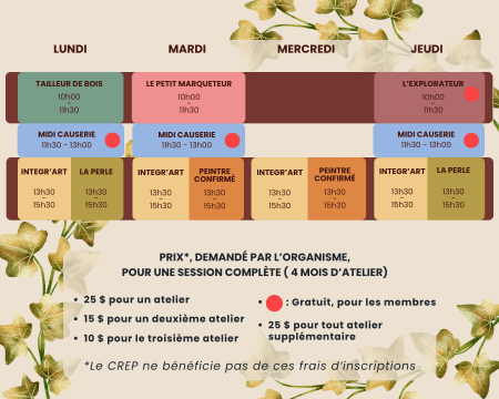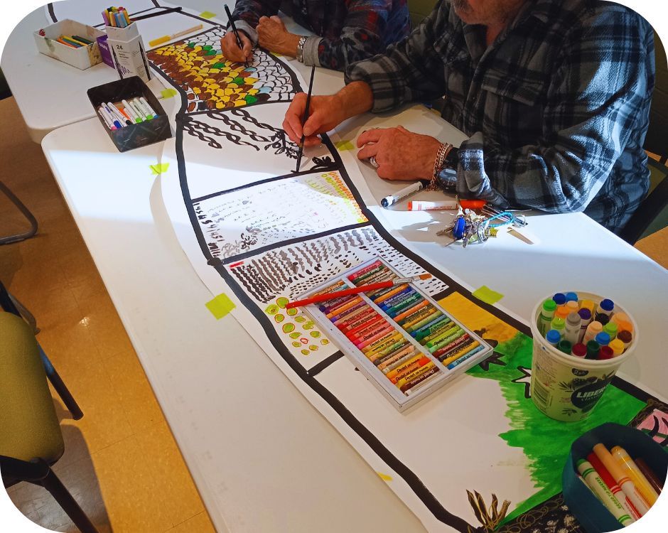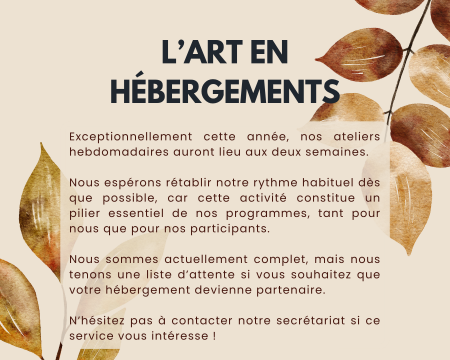 Atelier d'Art libre bi-mensuel au sein de ressources d'hébergement en santé mentale, ce service comprend des travaux de peintures, de dessins, coloriages, modelages, pyrogravures, bricolages et bien plus encore... Adaptées à tous les niveaux, afin que chacun puisse y trouver son compte. Nous fournissons le matériel indispensable pour création d'une oeuvre. Pour une saison, un montant de 5.00$ est demandé par participant.